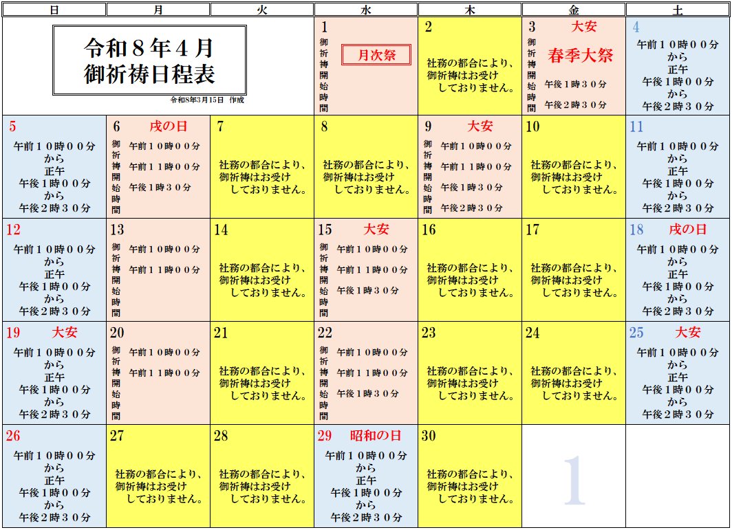 (“御祈祷開始時間”は日により時間が異なりますので、お気を付け下さい。)